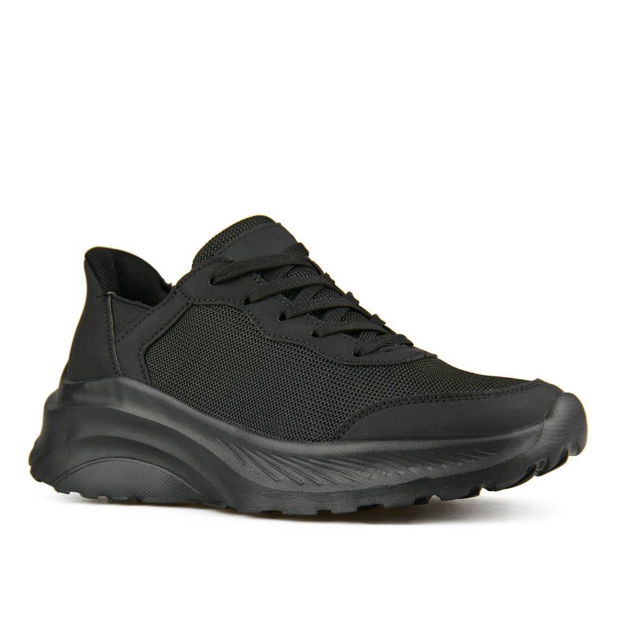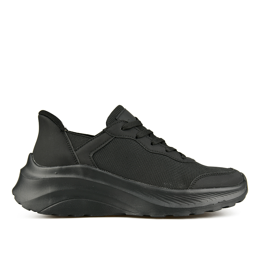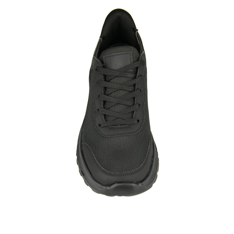 Γυναικεία sneakers δετά, σε μαύρο χρώμα, από οικολογικό δέρμα και ύφασμα και υφασμάτινη επένδυση.